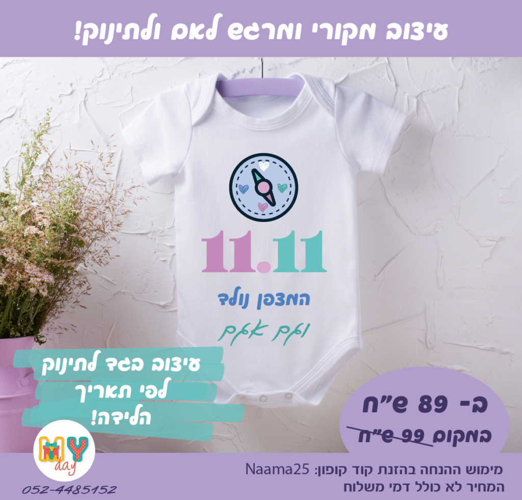 בגד גוף לתינוק עם עיצוב אישי לפי תאריך הלידה המשלב אירוע הסטורי שקרה באותו היום:) בגד שימושי, מרגש ועם ערך מוסף. למימוש ההנחה יש להכניס בטופס באתר את קוד הקופון: Naama2
